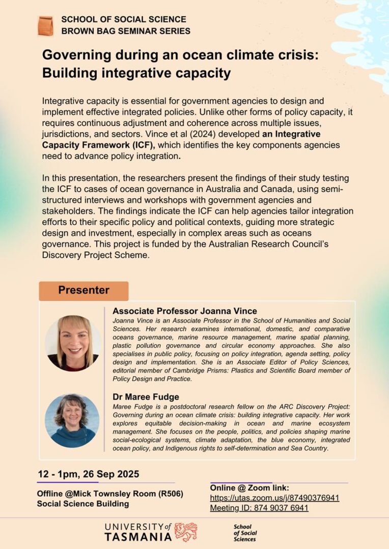 The UTAS School of Social Sciences welcome you to the Brown Bag Seminar 12-1pm this Friday, 26 Sep 25. The researchers, A.Prof Joanna Vince (CMS/UTAS) and Dr Maree Fudge (CMS/IMAS), will present the findings of a study on "Governing during an ocean climate crisis: Building integrative capacity".